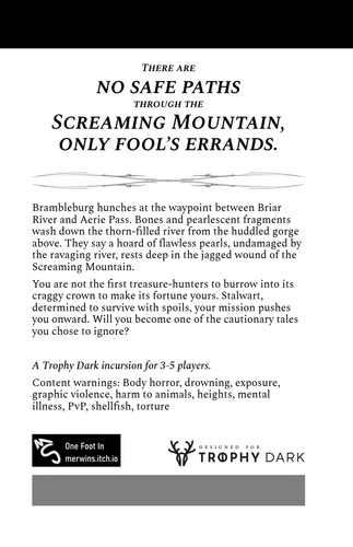 Brambleburg hunches at the waypoint between Briar River and Aerie Pass. Bones and pearlescent fragments wash down the thorn-filled river from the huddled gorge above. They say a hoard of flawless pearls, undamaged by the ravaging river, rests deep in the jagged wound of the Screaming Mountain.